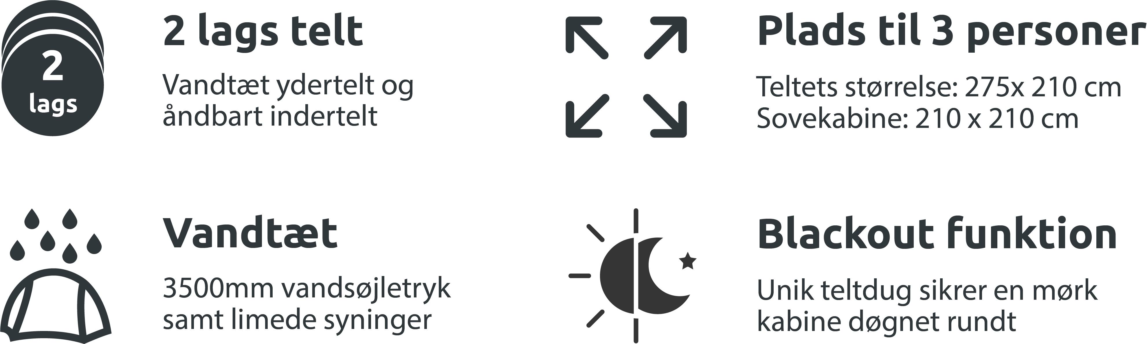 I kan længere nede på siden læse meget mere om forskellen på de 2 telte og soveposer. Alle produkter er vores eget kvalitetstestede brand.