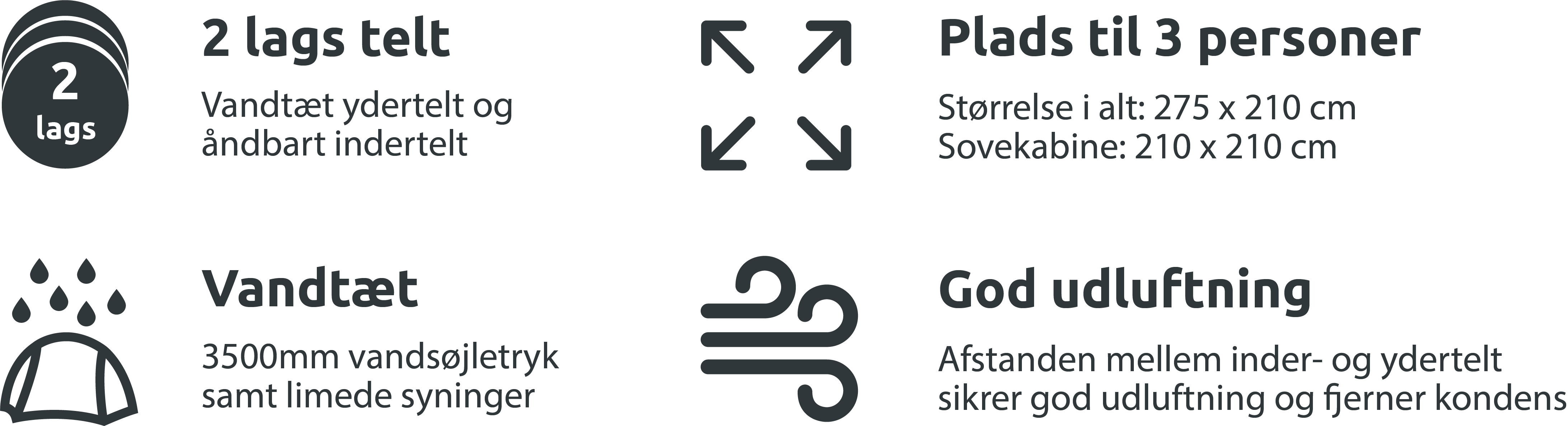 Derudover kan der vælges om der ønskes 2 eller 3 soveposer - det valgte telt har samme størrelse uanset antal soveposer.